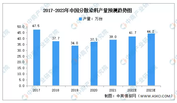 分散染料是所有染料中最為重要的染料類(lèi)別,也是產(chǎn)銷(xiāo)量最大的染料品種,已經(jīng)成為染料工業(yè)中的主要大類(lèi)產(chǎn)品。數(shù)據(jù)顯示,2021年我國(guó)分散染料產(chǎn)量為39萬(wàn)噸,占中國(guó)染料總產(chǎn)量的46.71%。預(yù)計(jì)2023年我國(guó)分散染料產(chǎn)量將達(dá)44.2萬(wàn)噸。